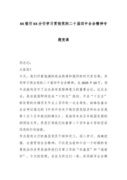 【七哥公文】2025年:XX银行XX分行学习贯彻党的二十届四中全会精神专题党课_副本+更多免费公文+VX:QiGeGongWen2024