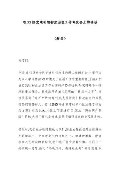 【七哥公文】2025年:在XX区党建引领物业治理工作调度会上的讲话(精品)_副本+更多免费公文+VX:QiGeGongWen2024