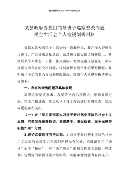 【七哥公文】2025年:某县政府办党组领导班子巡察整改专题民主生活会个人检视剖析材料+更多免费公文+VX:QiGeGongWen2024