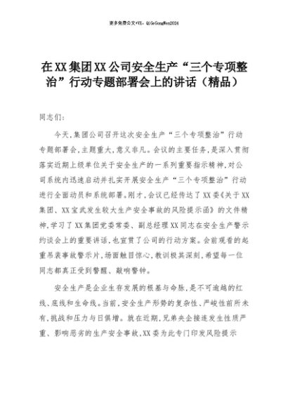 【七哥公文】2025年:在XX集团XX公司安全生产“三个专项整治”行动专题部署会上的讲话(精品)+更多免费公文+VX:QiGeGongWen2024