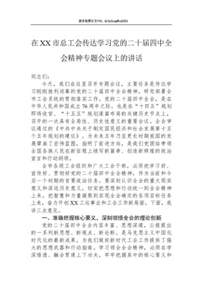 【七哥公文】2025年:在XX市总工会传达学习党的二十届四中全会精神专题会议上的讲话+更多免费公文+VX:QiGeGongWen2024