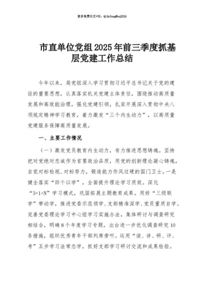 / 【七哥公文】2025年:市直单位党组2025年前三季度抓基层党建工作总结+更多免费公文+VX:QiGeGongWen2024