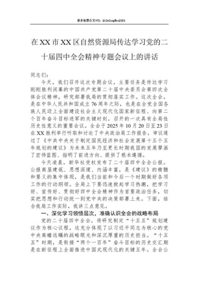 【七哥公文】2025年:在XX市XX区自然资源局传达学习党的二十届四中全会精神专题会议上的讲话+更多免费公文+VX:QiGeGongWen2024