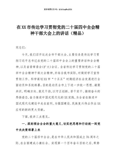 【七哥公文】2025年:在XX市传达学习贯彻党的二十届四中全会精神干部大会上的讲话(精品)+更多免费公文+VX:QiGeGongWen2024