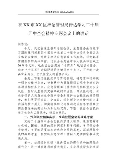 【七哥公文】2025年:在XX市XX区应急管理局传达学习二十届四中全会精神专题会议上的讲话+更多免费公文+VX:QiGeGongWen2024