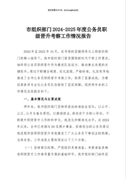 【七哥公文】2025年:市组织部门2024-2025年度公务员职级晋升考察工作情况报告+更多免费公文+VX:QiGeGongWen2024