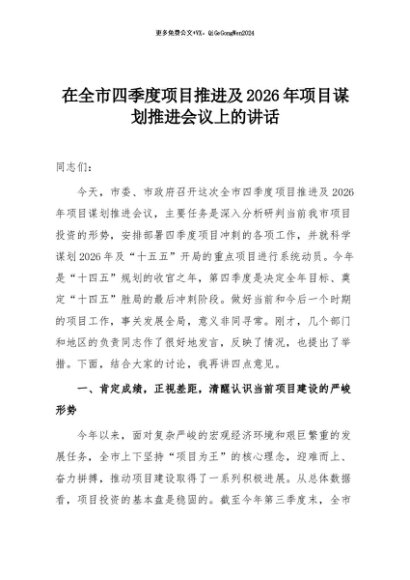 【七哥公文】2025年:在全市四季度项目推进及2026年项目谋划推进会议上的讲话+更多免费公文+VX:QiGeGongWen2024