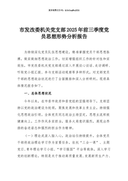 【七哥公文】2025年:市发改委机关党支部2025年前三季度党员思想形势分析报告+更多免费公文+VX:QiGeGongWen2024