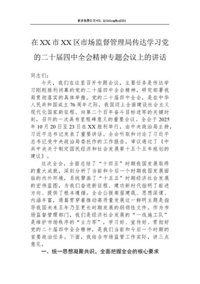 【七哥公文】2025年:在XX市XX区市场监督管理局传达学习党的二十届四中全会精神专题会议上的讲话+更多免费公文+VX:QiGeGongWen2024