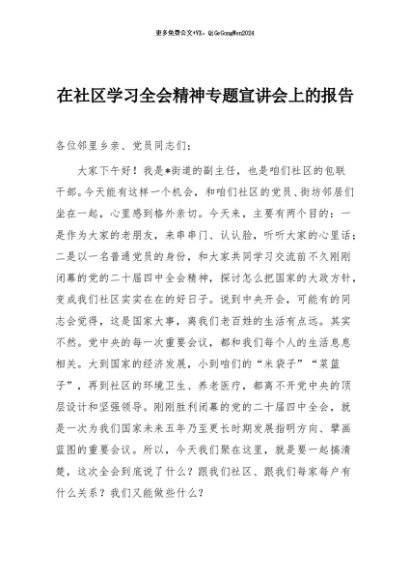 / 【七哥公文】2025年:在社区学习全会精神专题宣讲会上的报告+更多免费公文+VX:QiGeGongWen2024