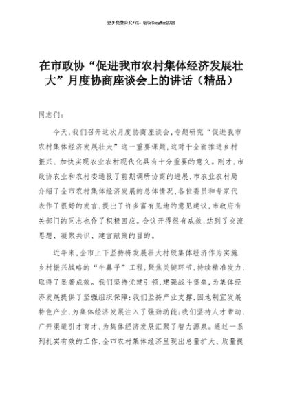 【七哥公文】2025年:在市政协“促进我市农村集体经济发展壮大”月度协商座谈会上的讲话(精品)+更多免费公文+VX:QiGeGongWen2024