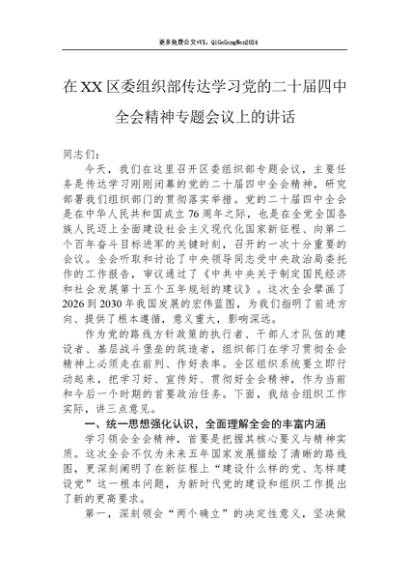 【七哥公文】2025年:在XX区委组织部传达学习党的二十届四中全会精神专题会议上的讲话+更多免费公文+VX:QiGeGongWen2024