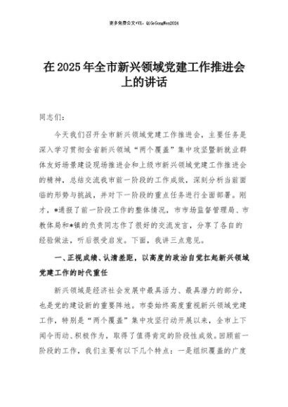 / 【七哥公文】2025年:在2025年全市新兴领域党建工作推进会上的讲话+更多免费公文+VX:QiGeGongWen2024