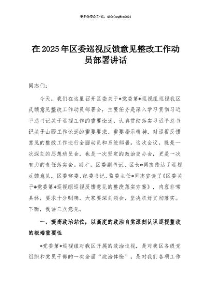 / 【七哥公文】2025年:在2025年区委巡视反馈意见整改工作动员部署讲话+更多免费公文+VX:QiGeGongWen2024