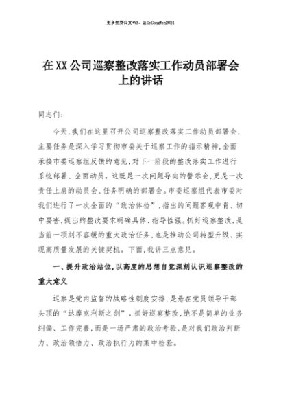 / 【七哥公文】2025年:在XX公司巡察整改落实工作动员部署会上的讲话+更多免费公文+VX:QiGeGongWen2024