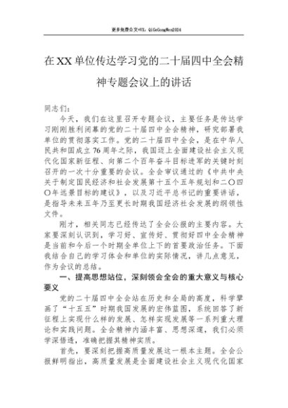 【七哥公文】2025年:在XX单位传达学习党的二十届四中全会精神专题会议上的讲话+更多免费公文+VX:QiGeGongWen2024