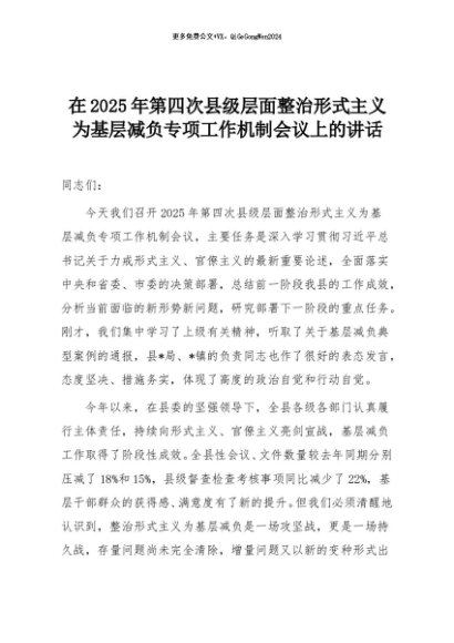【七哥公文】2025年:在2025年第四次县级层面整治形式主义为基层减负专项工作机制会议上的讲话+更多免费公文+VX:QiGeGongWen2024
