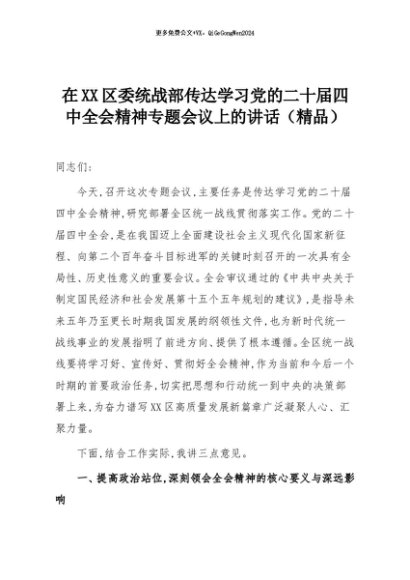 【七哥公文】2025年:在XX区委统战部传达学习党的二十届四中全会精神专题会议上的讲话(精品)+更多免费公文+VX:QiGeGongWen2024