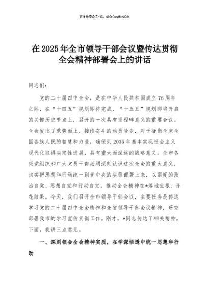 【七哥公文】2025年:在2025年全市领导干部会议暨传达贯彻全会精神部署会上的讲话+更多免费公文+VX:QiGeGongWen2024