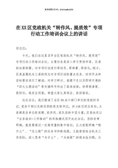 【七哥公文】2025年:在XX区党政机关“转作风、提质效”专项行动工作培训会议上的讲话+更多免费公文+VX:QiGeGongWen2024
