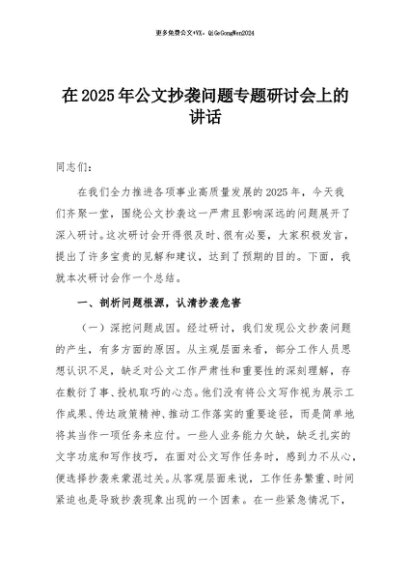 / 【七哥公文】2025年:在2025年公文抄袭问题专题研讨会上的讲话+更多免费公文+VX:QiGeGongWen2024