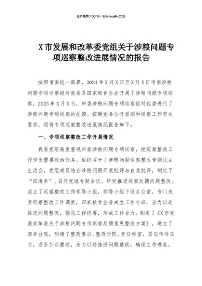 【七哥公文】2025年:X市发展和改革委党组关于涉粮问题专项巡察整改进展情况的报告+更多免费公文+VX:QiGeGongWen2024