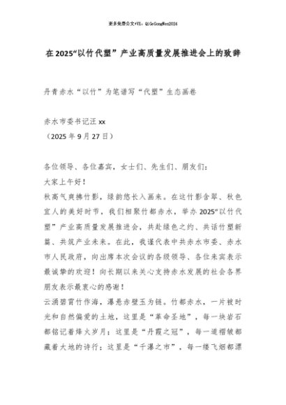【七哥公文】2025年:在2025“以竹代塑”产业高质量发展推进会上的致辞_副本+更多免费公文+VX:QiGeGongWen2024