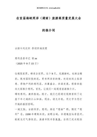 【七哥公文】2025年:在首届海峡两岸(湖南)旅游高质量发展大会的推介词_副本+更多免费公文+VX:QiGeGongWen2024