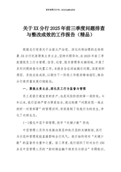 【七哥公文】2025年:关于XX分行2025年前三季度问题排查与整改成效的工作报告(精品)+更多免费公文+VX:QiGeGongWen2024