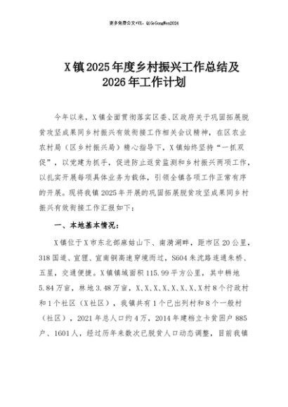 【七哥公文】2025年:X镇2025年度乡村振兴工作总结及2026年工作计划+更多免费公文+VX:QiGeGongWen2024