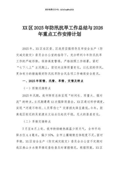 【七哥公文】2025年:XX区2025年防汛抗旱工作总结与2026年重点工作安排计划+更多免费公文+VX:QiGeGongWen2024