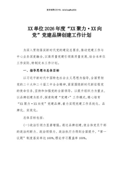 【七哥公文】2025年:XX单位2026年度“XX聚力·XX向党”党建品牌创建工作计划+更多免费公文+VX:QiGeGongWen2024