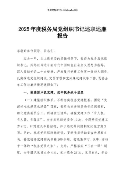 / 【七哥公文】2025年:2025年度税务局党组织书记述职述廉报告+更多免费公文+VX:QiGeGongWen2024