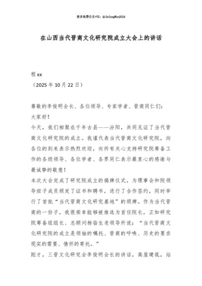 / 【七哥公文】2025年:在山西当代晋商文化研究院成立大会上的讲话_副本+更多免费公文+VX:QiGeGongWen2024