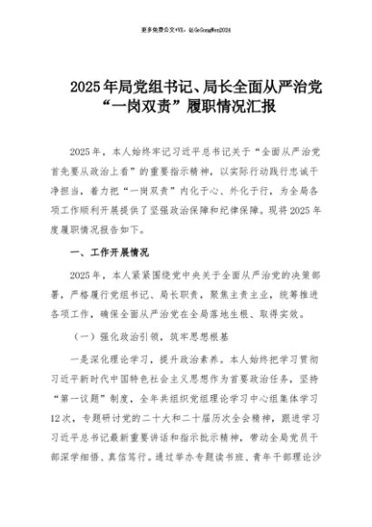 【七哥公文】2025年:2025年局党组书记、局长全面从严治党“一岗双责”履职情况汇报+更多免费公文+VX:QiGeGongWen2024
