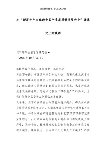 【七哥公文】2025年:在“新质生产力赋能食品产业高质量发展大会”开幕式上的致辞_副本+更多免费公文+VX:QiGeGongWen2024