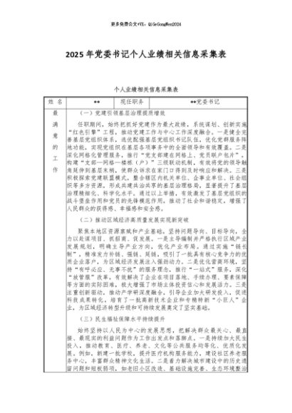 / 【七哥公文】2025年:2025年党委书记个人业绩相关信息采集表+更多免费公文+VX:QiGeGongWen2024