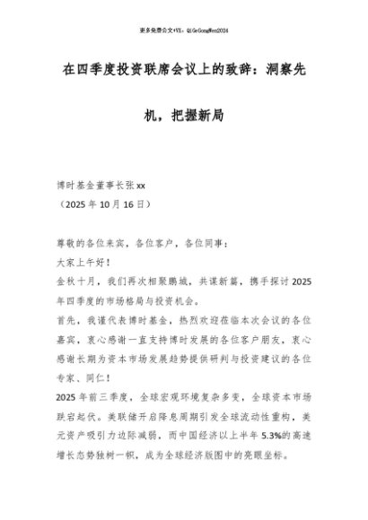 【七哥公文】2025年:在四季度投资联席会议上的致辞:洞察先机,把握新局_副本+更多免费公文+VX:QiGeGongWen2024