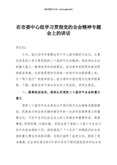/ 【七哥公文】2025年:在市委中心组学习贯彻党的全会精神专题会上的讲话+更多免费公文+VX:QiGeGongWen2024