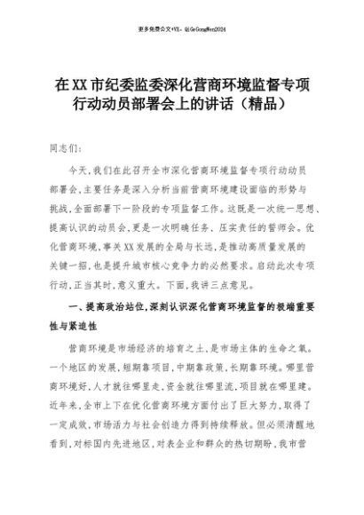 【七哥公文】2025年:在XX市纪委监委深化营商环境监督专项行动动员部署会上的讲话(精品)+更多免费公文+VX:QiGeGongWen2024