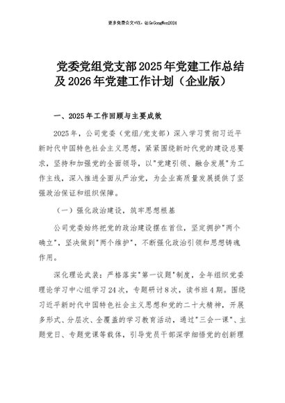 【七哥公文】2025年:党委党组党支部2025年党建工作总结及2026年党建工作计划(企业版)+更多免费公文+VX:QiGeGongWen2024