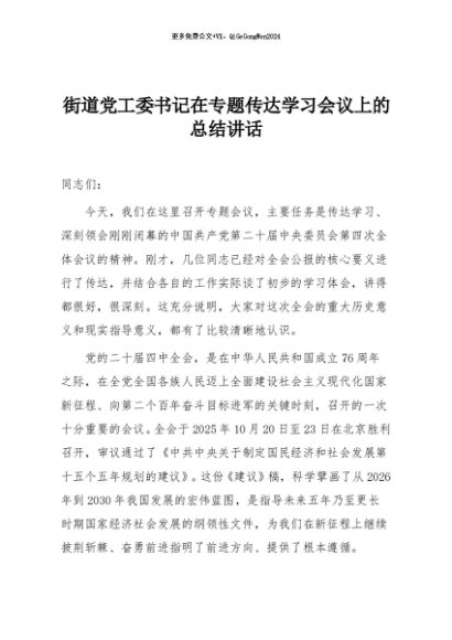 / 【七哥公文】2025年:街道党工委书记在专题传达学习会议上的总结讲话+更多免费公文+VX:QiGeGongWen2024