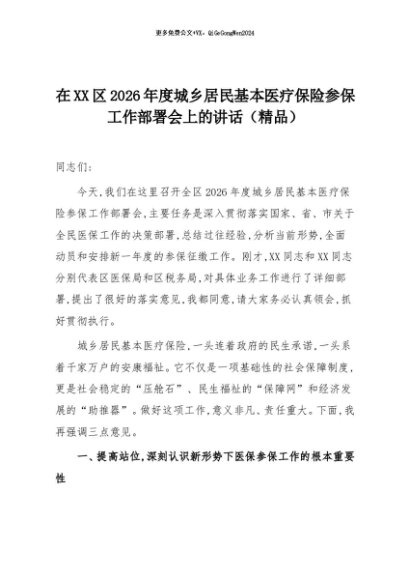 【七哥公文】2025年:在XX区2026年度城乡居民基本医疗保险参保工作部署会上的讲话(精品)+更多免费公文+VX:QiGeGongWen2024