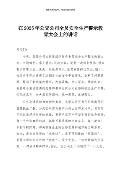 【七哥公文】2025年:在2025年公交公司全员安全生产警示教育大会上的讲话+更多免费公文+VX:QiGeGongWen2024