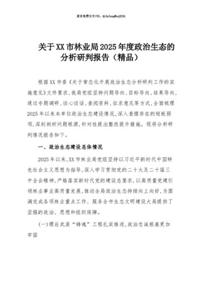 【七哥公文】2025年:关于XX市林业局2025年度政治生态的分析研判报告(精品)+更多免费公文+VX:QiGeGongWen2024