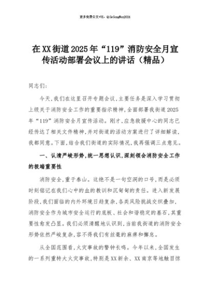 【七哥公文】2025年:在XX街道2025年“119”消防安全月宣传活动部署会议上的讲话(精品)+更多免费公文+VX:QiGeGongWen2024