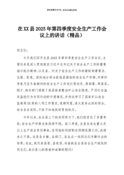 【七哥公文】2025年:在XX县2025年第四季度安全生产工作会议上的讲话(精品)+更多免费公文+VX:QiGeGongWen2024