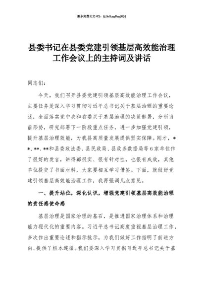 【七哥公文】2025年:县委书记在县委党建引领基层高效能治理工作会议上的主持词及讲话+更多免费公文+VX:QiGeGongWen2024