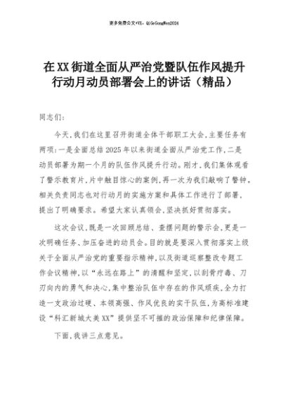 【七哥公文】2025年:在XX街道全面从严治党暨队伍作风提升行动月动员部署会上的讲话(精品)+更多免费公文+VX:QiGeGongWen2024