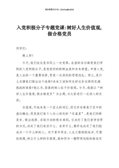 【七哥公文】2025年:入党积极分子专题党课:树好人生价值观,做合格党员+更多免费公文+VX:QiGeGongWen2024